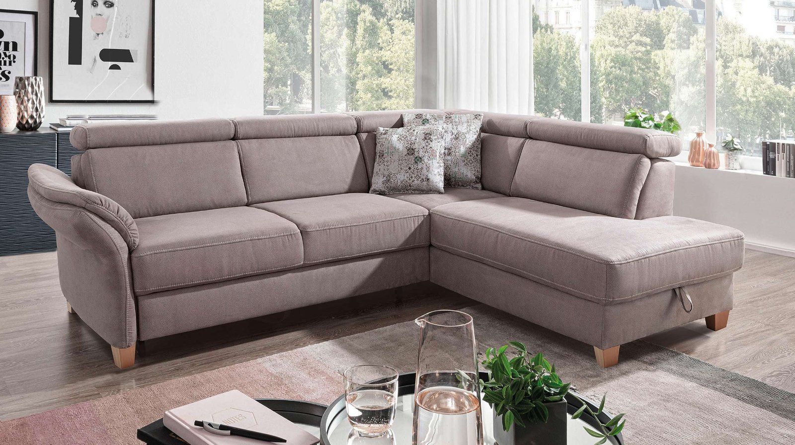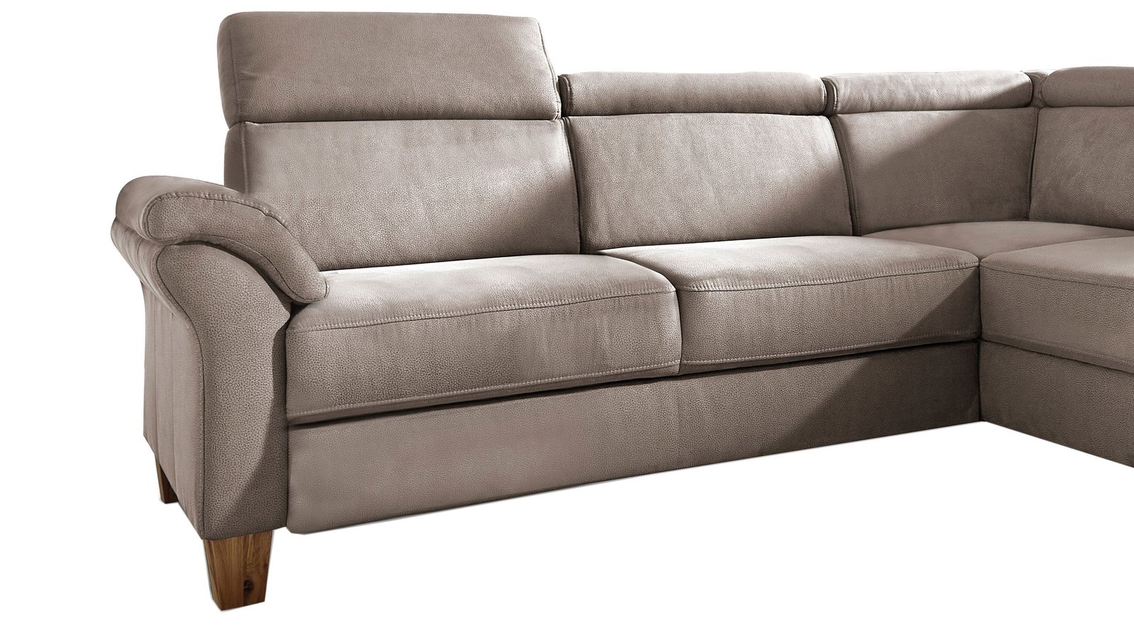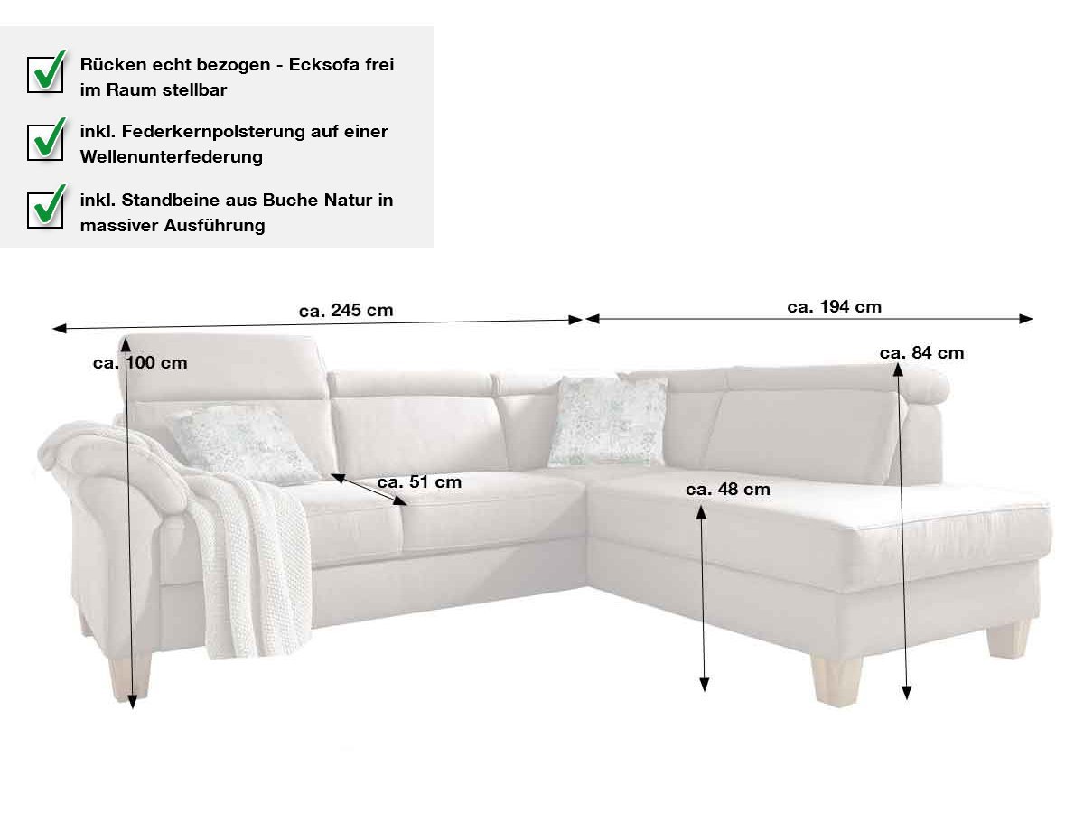 Ecksofa 245 cm grau (steelgrau) aus dem Sofaprogramm – ARNGAST In diesem Angebot präsentieren wir Ihnen das Ecksofa ARNGAST in der Basis Version. Dieses Sofa Programm können Sie beliebig in Farbe, Ausstattung, Form und Funktion in unserer Filiale sich zusammenstellen. Einen ersten Überblick über dieses Sofa Programm erhalten Sie über den Button Sofa Programm ansehen. Das Ecksofa Arngast überzeugt direkt auf den ersten Blick. Für den Polsterbezug wurde die Kombination in „steelgrau“ mit abgesetzten Kontrastnähten gewählt. Somit entsteht ein attraktiver Look, der in diesem Beispiel mit Standbeinen aus Buche Natur ergänzt wurde. Der Rücken wurde ebenfalls bezogen und somit haben Sie die freie Wahl, wo demnächst Ihr neues Ecksofa seinen Platz finden wird. Ausstattung Ecksofa ARNGAST in der BASIS VERSION: inkl. Kopfteile – nicht verstellbar Federkernpolsterung auf Wellenunterfederung frei im Raum stellbar – Rücken echt bezogen Standbeine in Massiv Buche Natur ohne Kissen, ohne Kopfteilverstellung in der Basis Version Beachten Sie bitte bei der Montage: Das Ecksofa kann nur mit dem Ottomanen rechts- montiert werden, so wie auf der Abbildung zu erkennen. Bestellen Sie noch heute Ihr neues Ecksofa Arngast in der Basis Version bequem online. Alternativ freuen sich unsere Einrichtungsexperten auf Ihren Besuch und die gemeinsame individuelle Planung.