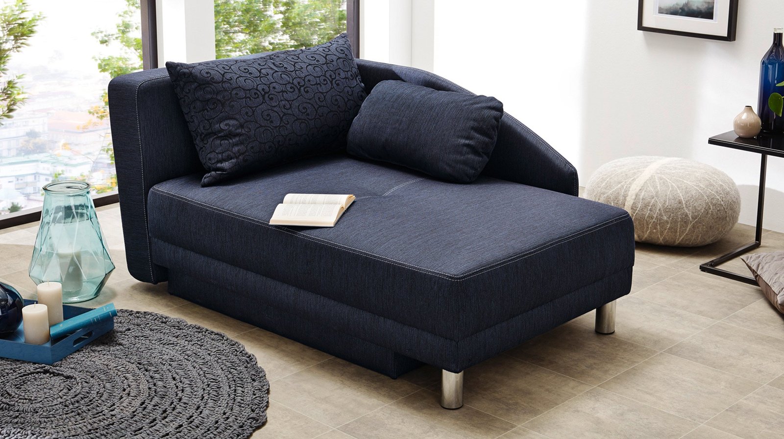 Recamiere mit Bettkasten und Federkernpolsterung – REUBEN Unsere Recamiere bringt Ästhetik und Entspannung in Ihre vier Wände!Eine komfortable Recamiere erwartet Sie in diesem Angebot. Diese zeitlos gestaltete Liege mit Bettkasten lädt formschön zum Relaxen im Wohnzimmer ein. In der Farbwahl blau passt sich dieses Sofa vielen Einrichtungsideen an und überzeugt dabei mit einer zeitgerechten Optik. Außerdem fügen sich die silberfarbenen Füße harmonisch ins Gesamtbild ein. Aber auch die inneren Werte können sich sehen lassen. Verwandeln Sie die Recamiere doch einfach in ein Schlafsofa und profitieren Sie dabei von der integrierten Federkernpolsterung für genüssliche Stunden der Entspannung. Für wohliges Ausstrecken steht Ihnen eine ca. 82 x 200 cm große Liegefläche zur Verfügung, sodass die Recamiere ebenso als Querschläfer für eine Person genutzt werden kann. Ebenfalls wurde an einen ausreichenden Stauraum gedacht. Ihre Tagesdecken oder Kissen finden in dem Bettkasten Ihren Platz oder nutzen Sie diesen Raum für das Spielzeug Ihrer Kleinsten in der Familie. Passend zu Ihrer neuen Recamiere erhalten Sie von uns ein geschmackvolles Rücken- sowie Nierenkissen. Da auch die Rückseite echt bezogen wurde, können Sie das Sofa frei nach Wahl in Ihren Räumlichkeiten platzieren. Bestellen Sie Ihre neue Recamiere gleich heute online oder besuchen Sie uns vor Ort in einer unserer Filialen. Wir freuen uns auf Ihren Besuch!