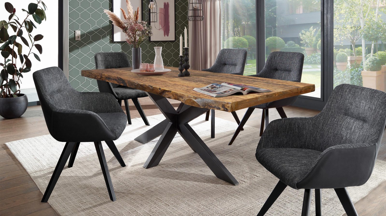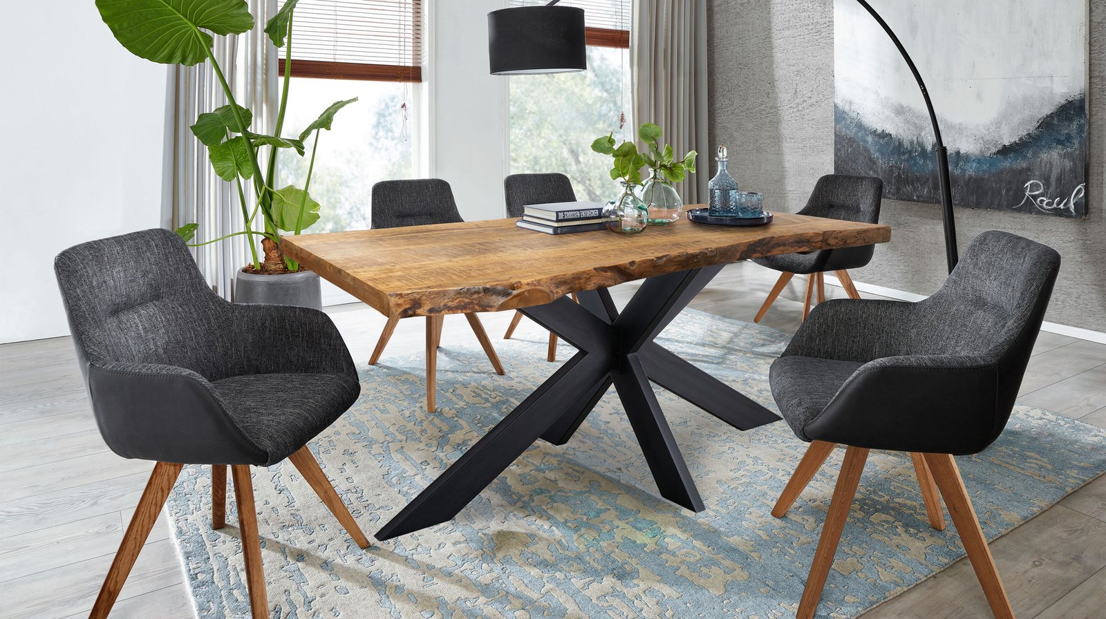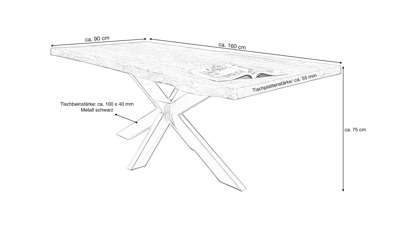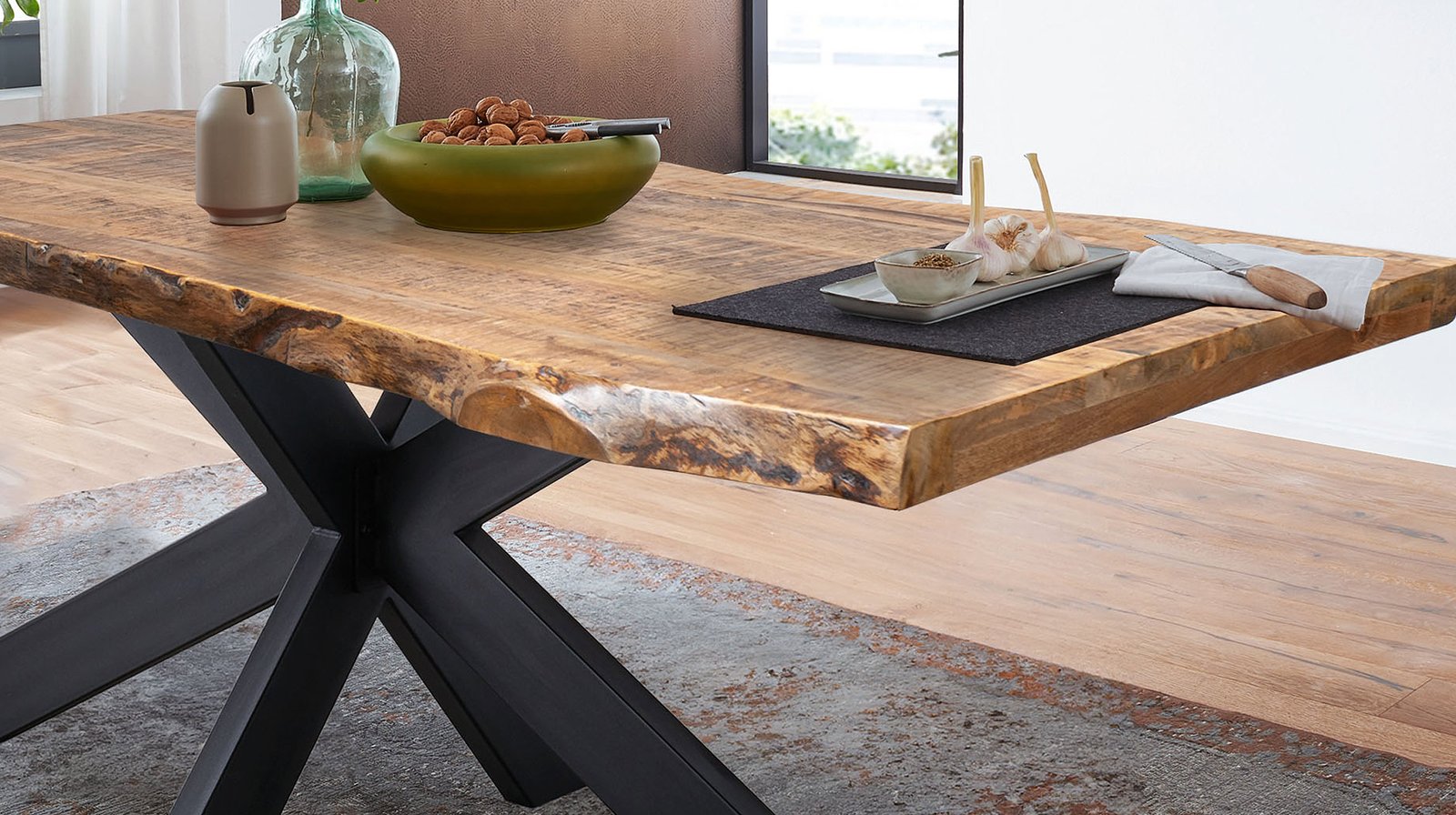 Baumkantentisch 160 cm Massivholz echte Baumkante – TIMUnser stilvoller Baumkantentisch aus massivem lackierten Mangoholz überzeugt durch eine perfekte Kombination aus Natürlichkeit und modernen Akzenten. Besonders hervorzuheben sind die Tischkanten unseres Baumkantentischs TIM, die der natürlichen Form des Baumes entsprechen und direkt aus dem Baumstamm geschnitten wurden. Das schwarze Spider-Gestell aus Metall sorgt für einen stabilen Stand und verleiht dem Tisch eine moderne Komponente.Unsere Baumkantentische sind dank Ihrer Individualität immer einzigartig in Farbe und Form. Jeder Tisch ist vom natürlichen Wuchs und der Maserung des verwendeten Holzes geprägt und Sie erhalten beim Kauf ein unverwechselbares Unikat mit echter Baumkante. Da es sich hier um ein Naturprodukt handelt, können Astlöcher, kleine Unebenheiten sowie kleine Risse, Fugen, kleine Löcher oder eine unterschiedliche Farbgebung auftreten; welche jedoch keine Fehler darstellen sondern vielmehr den individuellen Charakter des Echtholzes unterstreichen. Die genannten Maßangaben können aufgrund der asymmetrischen Formgebung etwas variieren.Mango Holz gebeizt lackiert: Mangoholz weist einen außergewöhnlich warmen goldbraunen bis gelbbraunen Farbton auf, welcher oft mit dunkelbraunen oder schwarzen Streifen durchzogen ist. Die unverwechselbare Maserung mit variierenden Mustern macht das Holz zu einer attraktiven Wahl für die Möbelherstellung und verleiht das einzigartige exotische Aussehen. Je nach Lichteinwirkung kann sich die Farbe des Mango-Holzes vertiefen, was zu einer noch reichhaltigeren und intensiveren Farbgebung führt.Bestellen Sie noch heute bequem von Zuhause oder lassen Sie sich von unseren Experten beraten.Wir freuen uns auf Sie!
