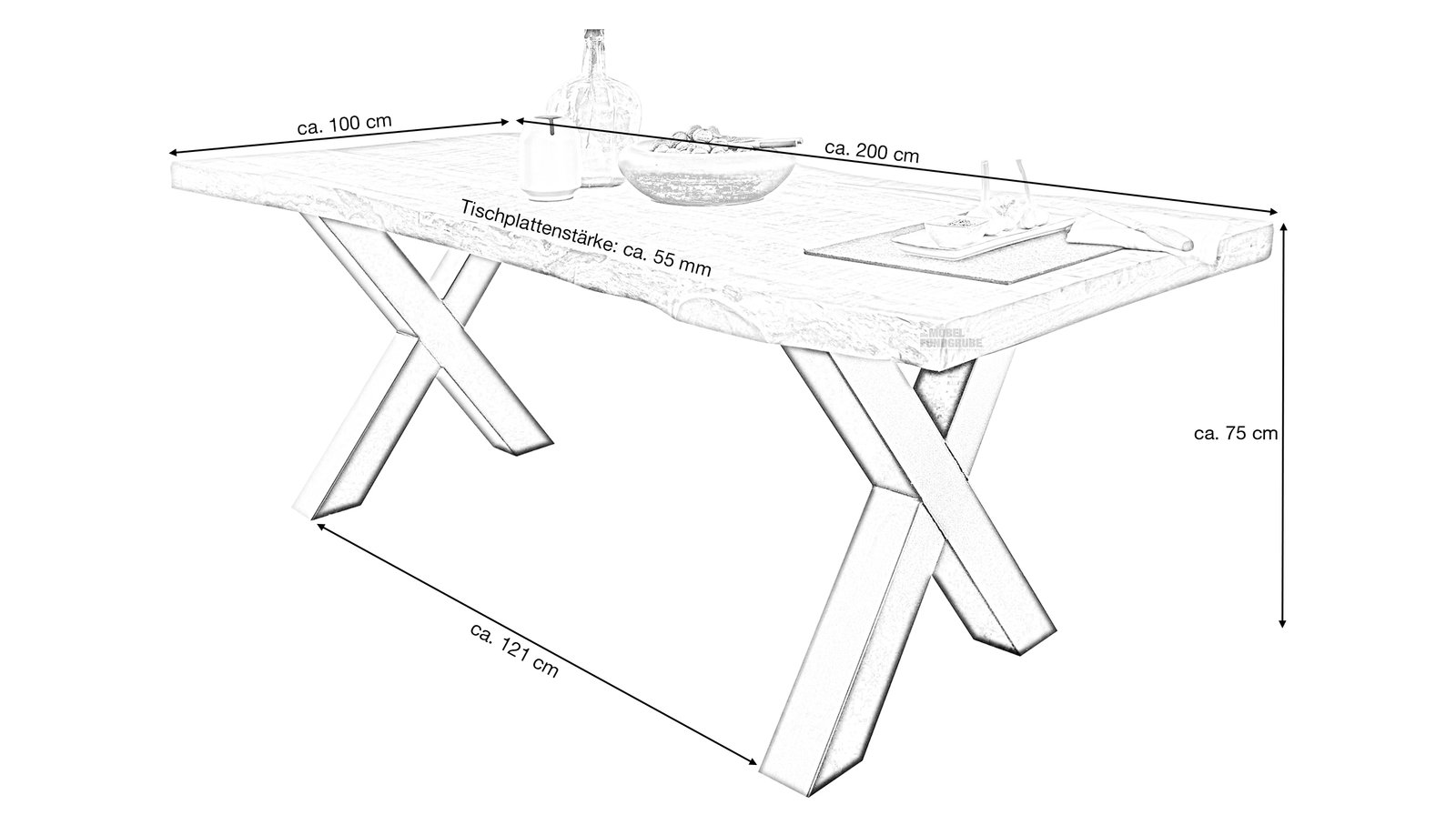 Baumkantentisch 200 Massivholz echte Baumkante – TOMASOUnser stilsicherer Baumkantentisch aus massivem Mangoholz überzeugt durch eine perfekte Kombination aus wärme bringendem Naturholz und kühlendem, schwarzem Metall. Besonders hervorzuheben sind die Tischkanten unseres Baumkantentischs TOMASO, die der natürlichen Form des Baumes entsprechen und direkt aus dem Baumstamm geschnitten wurden. Das X-förmige schwarz lackierte Gestell sorgt für einen stabilen Stand und verleiht dem Tisch eine moderne Komponente.Unsere Baumkantentische sind dank Ihrer Individualität immer einzigartig in Farbe und Form. Jeder Tisch ist vom natürlichen Wuchs und der Maserung des verwendeten Holzes geprägt und Sie erhalten beim Kauf ein unverwechselbares Unikat mit echter Baumkante. Da es sich hier um ein Naturprodukt handelt, können Astlöcher, kleine Unebenheiten sowie kleine Risse, Fugen, kleine Löcher oder eine unterschiedliche Farbgebung auftreten; welche jedoch keine Fehler darstellen sondern vielmehr den individuellen Charakter des Echtholzes unterstreichen. Die genannten Maßangaben können aufgrund der asymmetrischen Formgebung etwas variieren. Mango Holz gebeizt und lackiert: Mangoholz weist einen außergewöhnlich warmen goldbraunen bis gelbbraunen Farbton auf, welcher oft mit dunkelbraunen oder schwarzen Streifen durchzogen ist. Die unverwechselbare Maserung mit variierenden Mustern macht das Holz zu einer attraktiven Wahl für die Möbelherstellung und verleiht das einzigartige exotische Aussehen. Je nach Lichteinwirkung kann sich die Farbe des Mango-Holzes vertiefen, was zu einer noch reichhaltigeren und intensiveren Farbgebung führt. Sichern Sie sich noch heute Ihren neuen Esszimmertisch und bestellen Sie bequem in unserem Online Shop. Natürlich stehen Ihnen auch gerne unsere Berater vor Ort in einer unserer Filialen zur Verfügung. Wir freuen uns auf Ihren Besuch!