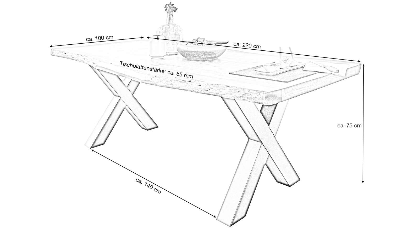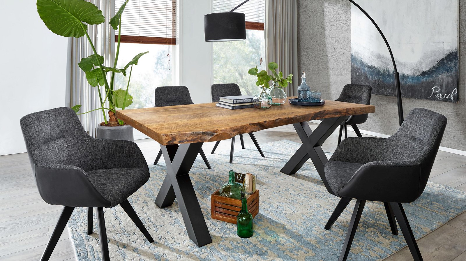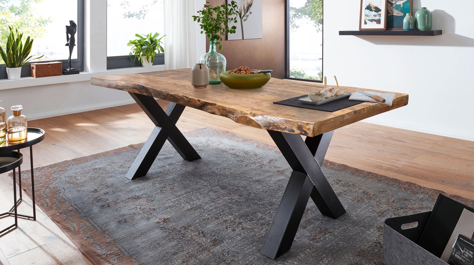 Baumkantentisch 220 Massivholz echte Baumkante – TOMASOUnser stilsicherer Baumkantentisch aus massivem Mangoholz überzeugt durch eine perfekte Kombination aus wärme bringendem Naturholz und kühlendem, schwarzem Metall. Besonders hervorzuheben sind die Tischkanten unseres Baumkantentischs TOMASO, die der natürlichen Form des Baumes entsprechen und direkt aus dem Baumstamm geschnitten wurden. Das X-förmige schwarz lackierte Gestell sorgt für einen stabilen Stand und verleiht dem Tisch eine moderne Komponente.Unsere Baumkantentische sind dank Ihrer Individualität immer einzigartig in Farbe und Form. Jeder Tisch ist vom natürlichen Wuchs und der Maserung des verwendeten Holzes geprägt und Sie erhalten beim Kauf ein unverwechselbares Unikat mit echter Baumkante. Da es sich hier um ein Naturprodukt handelt, können Astlöcher, kleine Unebenheiten sowie kleine Risse, Fugen, kleine Löcher oder eine unterschiedliche Farbgebung auftreten; welche jedoch keine Fehler darstellen sondern vielmehr den individuellen Charakter des Echtholzes unterstreichen. Die genannten Maßangaben können aufgrund der asymmetrischen Formgebung etwas variieren. Mango Holz gebeizt und lackiert: Mangoholz weist einen außergewöhnlich warmen goldbraunen bis gelbbraunen Farbton auf, welcher oft mit dunkelbraunen oder schwarzen Streifen durchzogen ist. Die unverwechselbare Maserung mit variierenden Mustern macht das Holz zu einer attraktiven Wahl für die Möbelherstellung und verleiht das einzigartige exotische Aussehen. Je nach Lichteinwirkung kann sich die Farbe des Mango-Holzes vertiefen, was zu einer noch reichhaltigeren und intensiveren Farbgebung führt. Sichern Sie sich noch heute Ihren neuen Esszimmertisch und bestellen Sie bequem in unserem Online Shop. Natürlich stehen Ihnen auch gerne unsere Berater vor Ort in einer unserer Filialen zur Verfügung. Wir freuen uns auf Ihren Besuch!