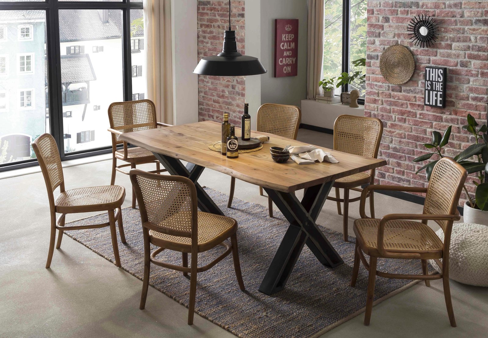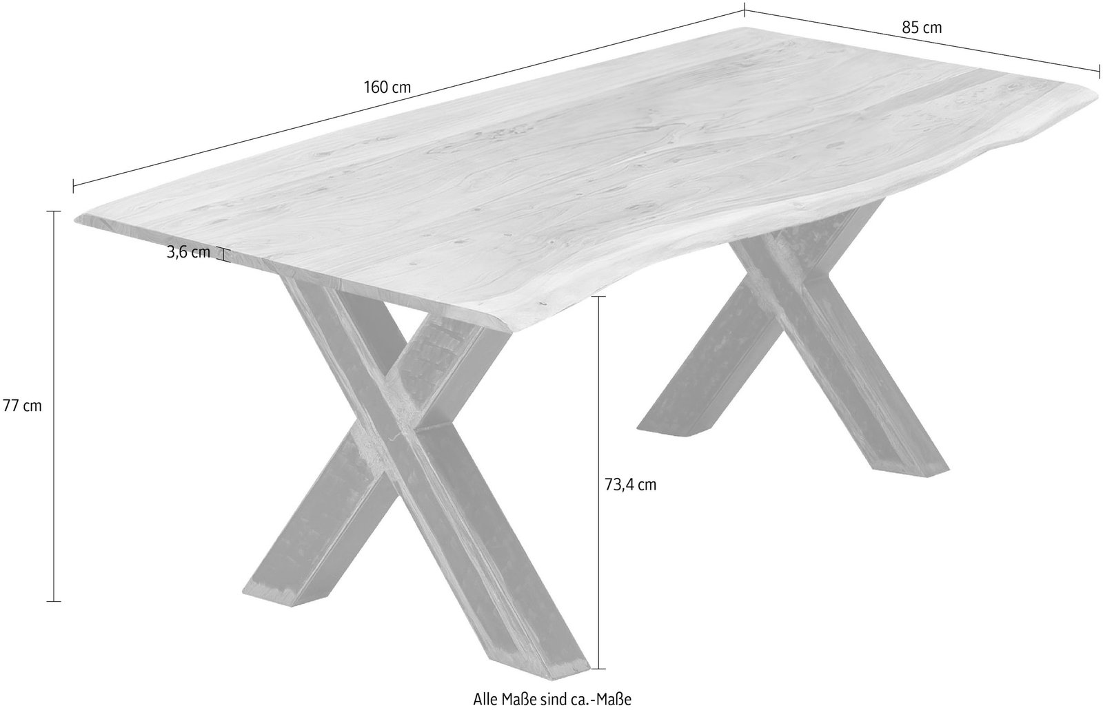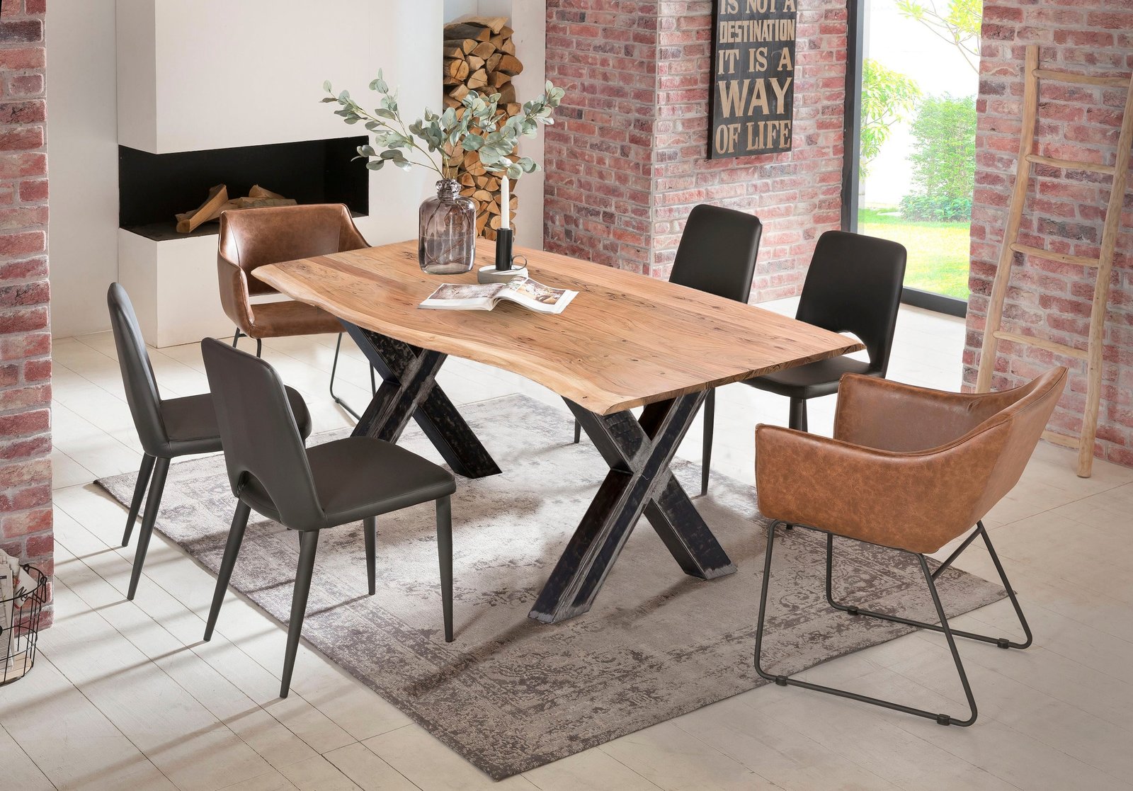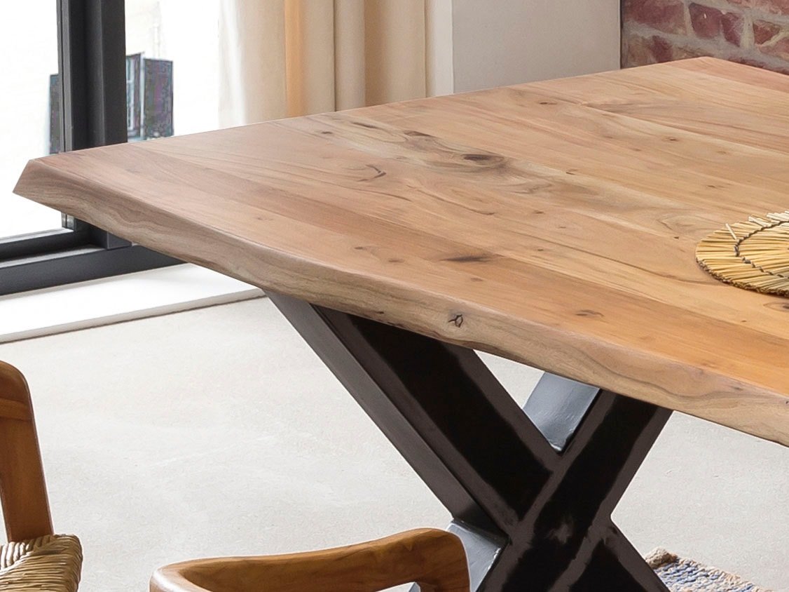 Mit Baumkante wie gewachsen. Rustikales X-Gestell aus Metall im Used-Look. Dank einzigartiger Maserung ein Unikat. Moderner Materialmix. Esstisch aus der Serie TABLES & CO